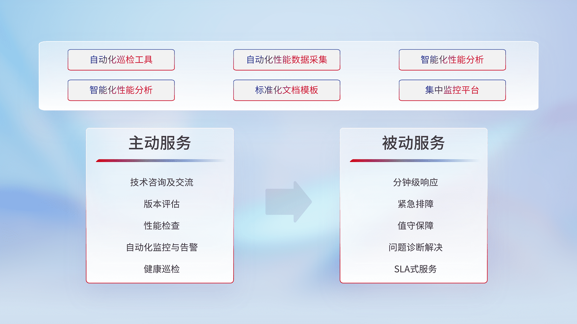 智能化工具和标准化文档,,,保障服务质量,,提供主动服务(包含技术咨询、、版本评估、、、性能检查、、、、自动化监控与告警、、健康巡检)和被动服务包含(分钟级响应、、紧急排障、、、值守保障、、问题诊断解决、、、SLA服务)。。